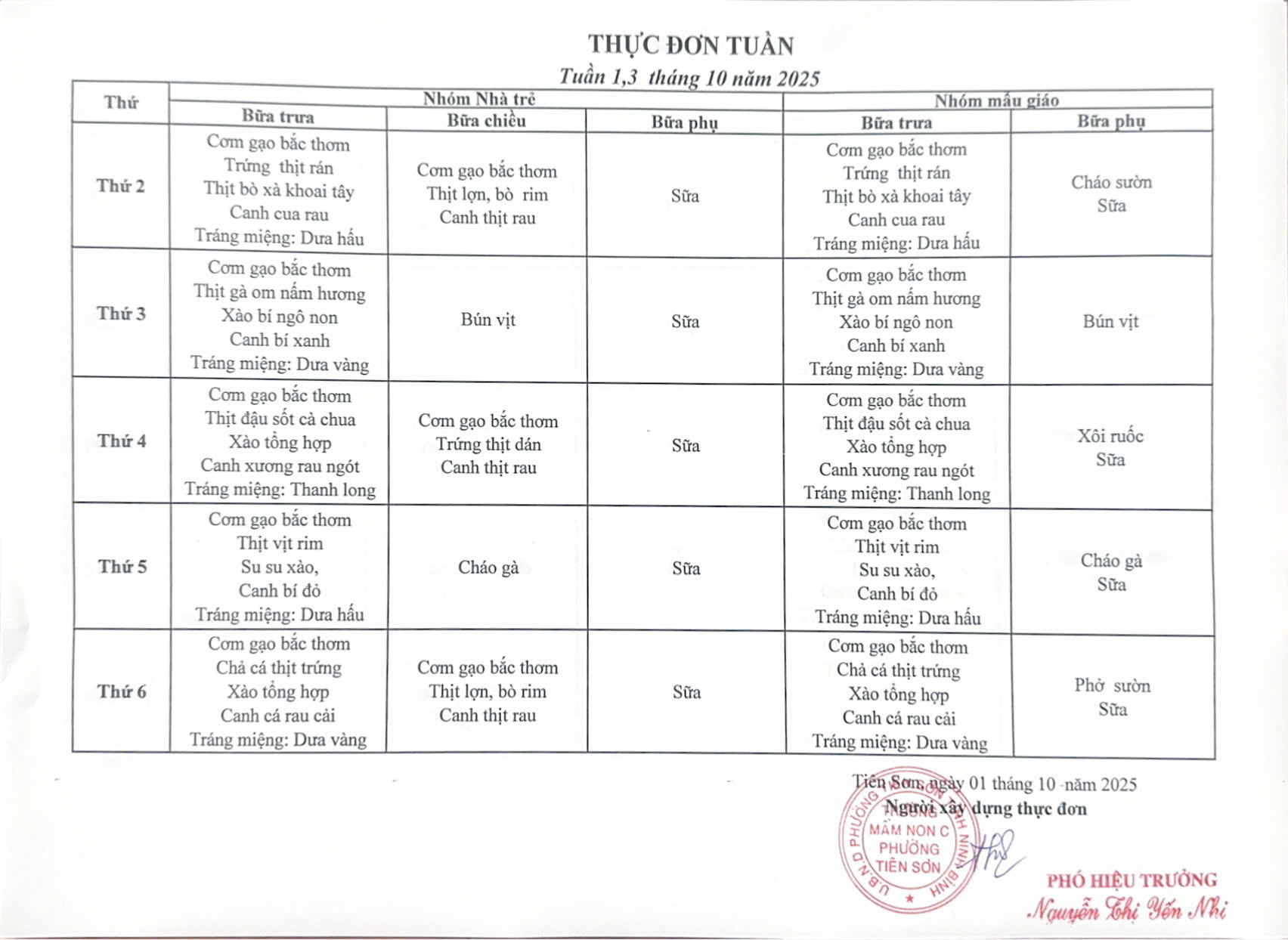 Nhằm thực hiện tốt công tác chăm sóc, nuôi dưỡng trẻ và đảm bảo công khai, minh bạch trong tổ chức bán trú, Trường Mầm non C phường Tiên Sơn trân trọng công khai thực đơn tháng 10 năm 2025 dành cho nhóm nhà trẻ và nhóm mẫu giáo.