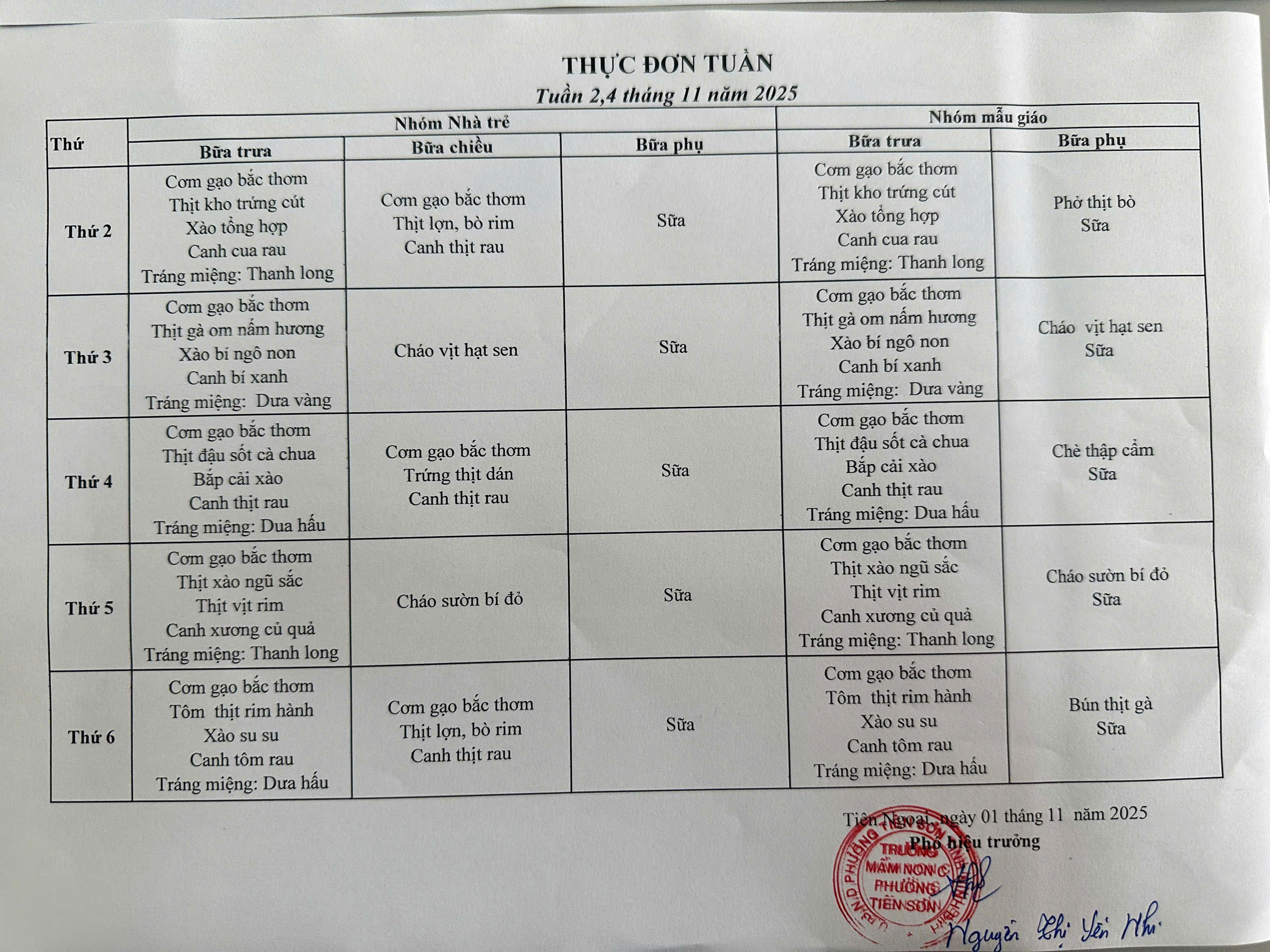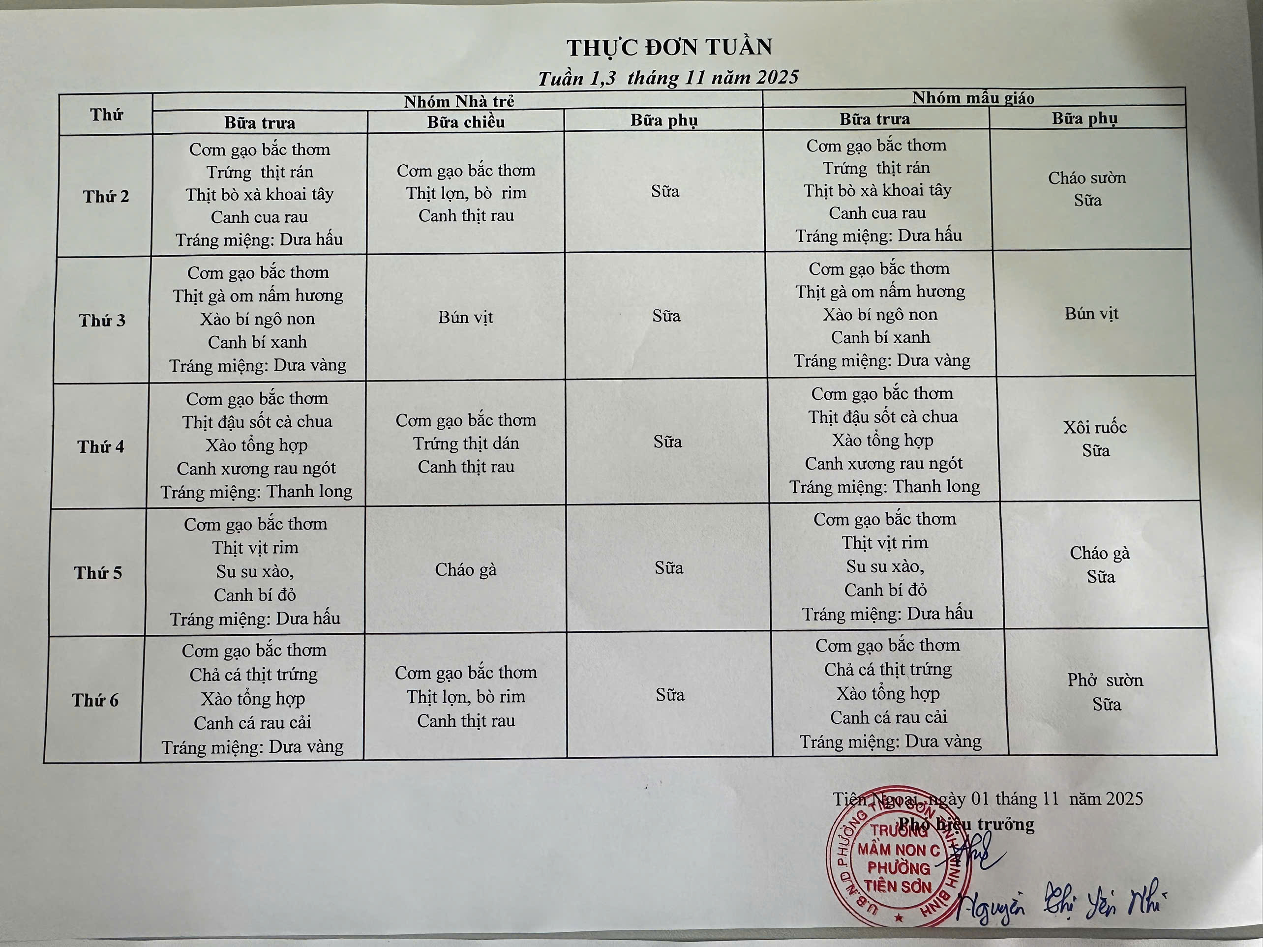 Thực hiện công tác chăm sóc, nuôi dưỡng trẻ theo đúng quy định của Bộ Giáo dục và Đào tạo, Trường Mầm non C phường Tiên Sơn trân trọng thông báo thực đơn tuần áp dụng cho các bé trong tháng 11 năm 2025 (Tuần 1,3 và Tuần 2,4).